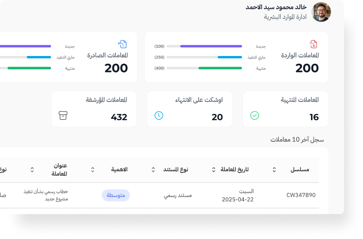 ادخل عصر الإدارة الذكية الذي يمكّنك من تتبع كل مراسلة بدقة، توفير الوقت والجهد، تعزيز التعاون بين الفرق، والاعتماد على البيانات لحسم القرارات، مما يجعل أعمالك أكثر سرعة، أمانًا، وفعالية من أي وقت مضى